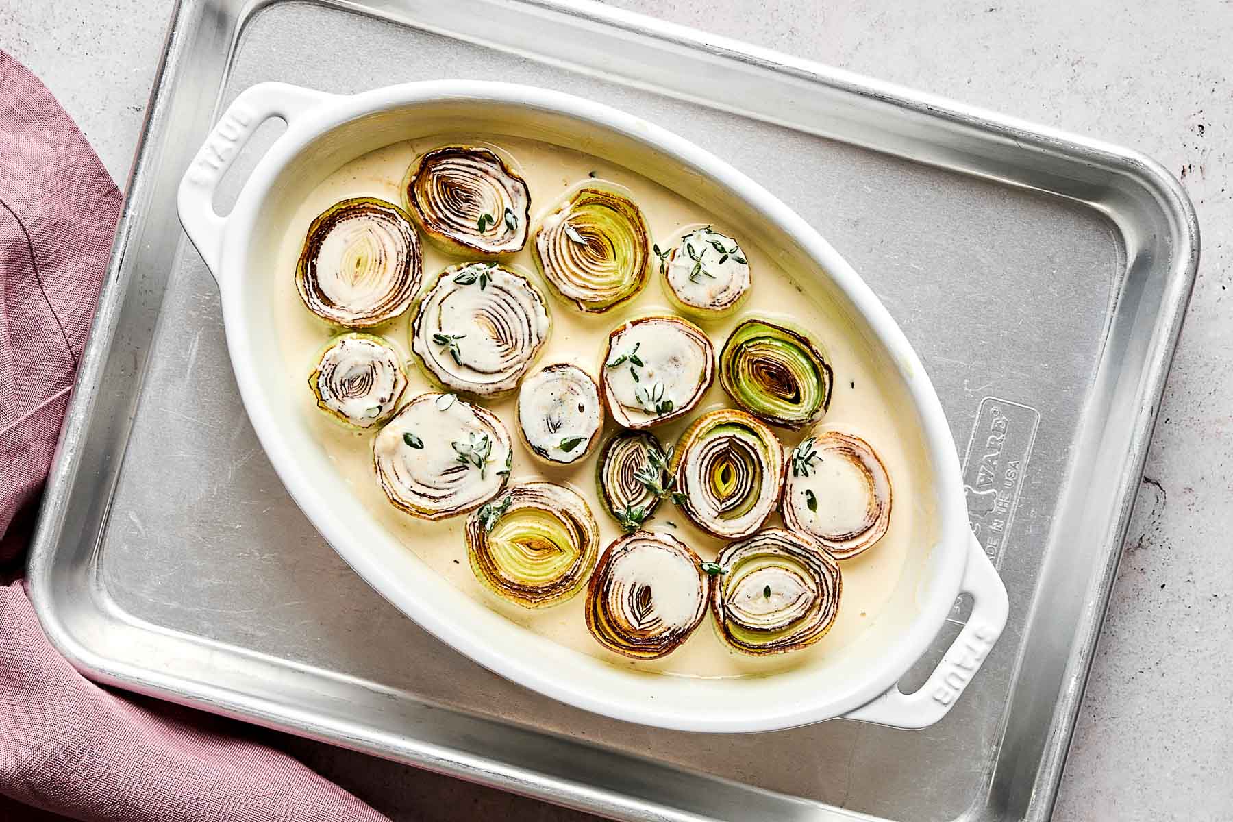 - Assemble and braise the leeks: Pour the thickened cream sauce over the leeks. The liquid should come nearly to the tops of the leeks without fully submerging them. Cover the baking dish tightly with foil. Transfer to the oven and bake for 35-40 minutes, until the leeks are very tender and easily pierced with a fork.