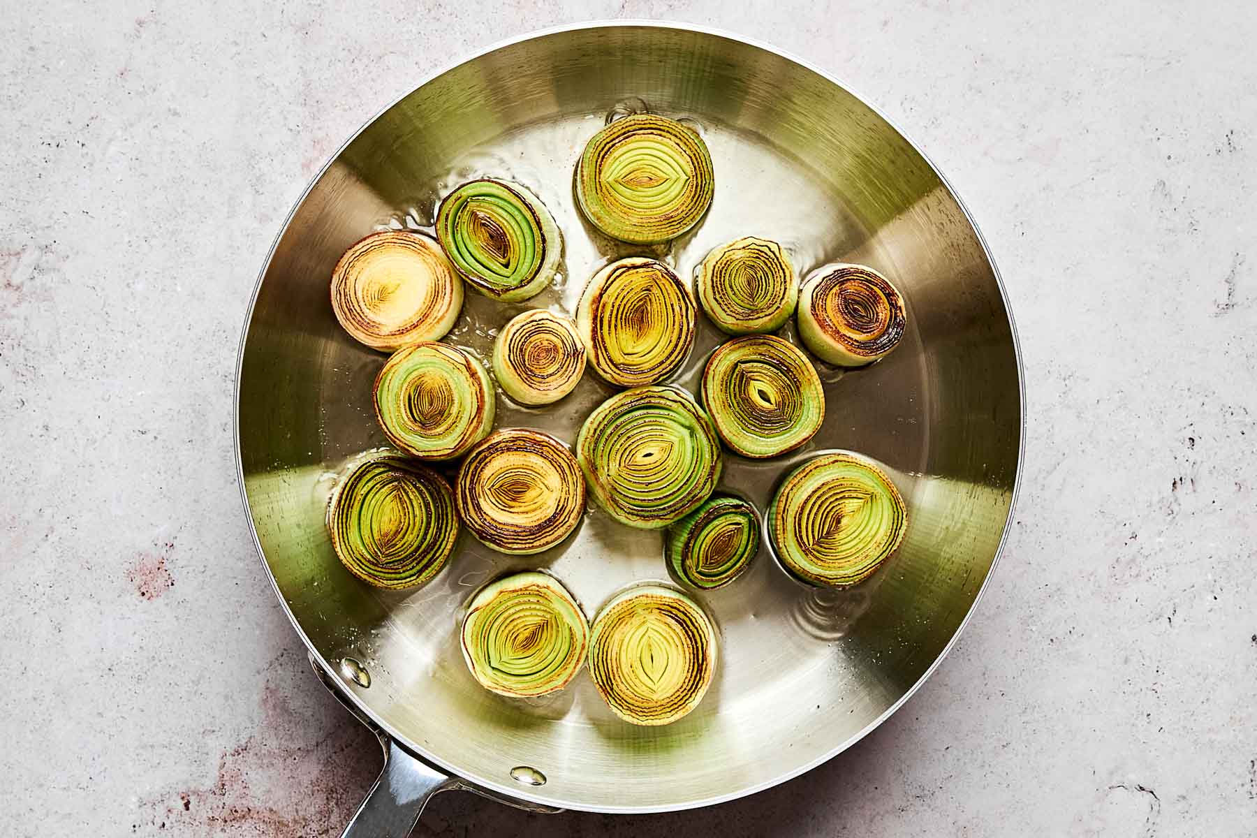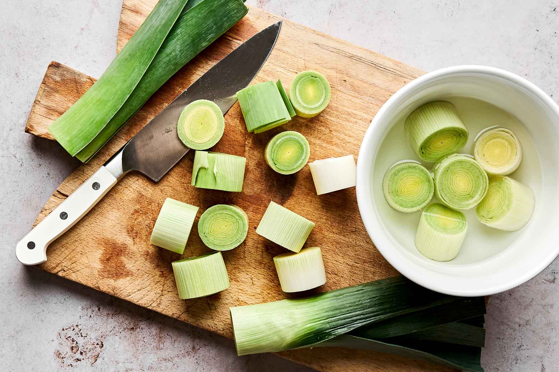 - Clean the leeks: Trim the dark green tops and root ends. Slice the leeks crosswise into 1-inch pieces. Check the cut sides and, if an outer ring looks tough or dirt is trapped between layers, trim away just that outer section and discard. Transfer the sliced leeks to a bowl of cold water and let sit several minutes to loosen any remaining grit. Lift out and pat very dry.