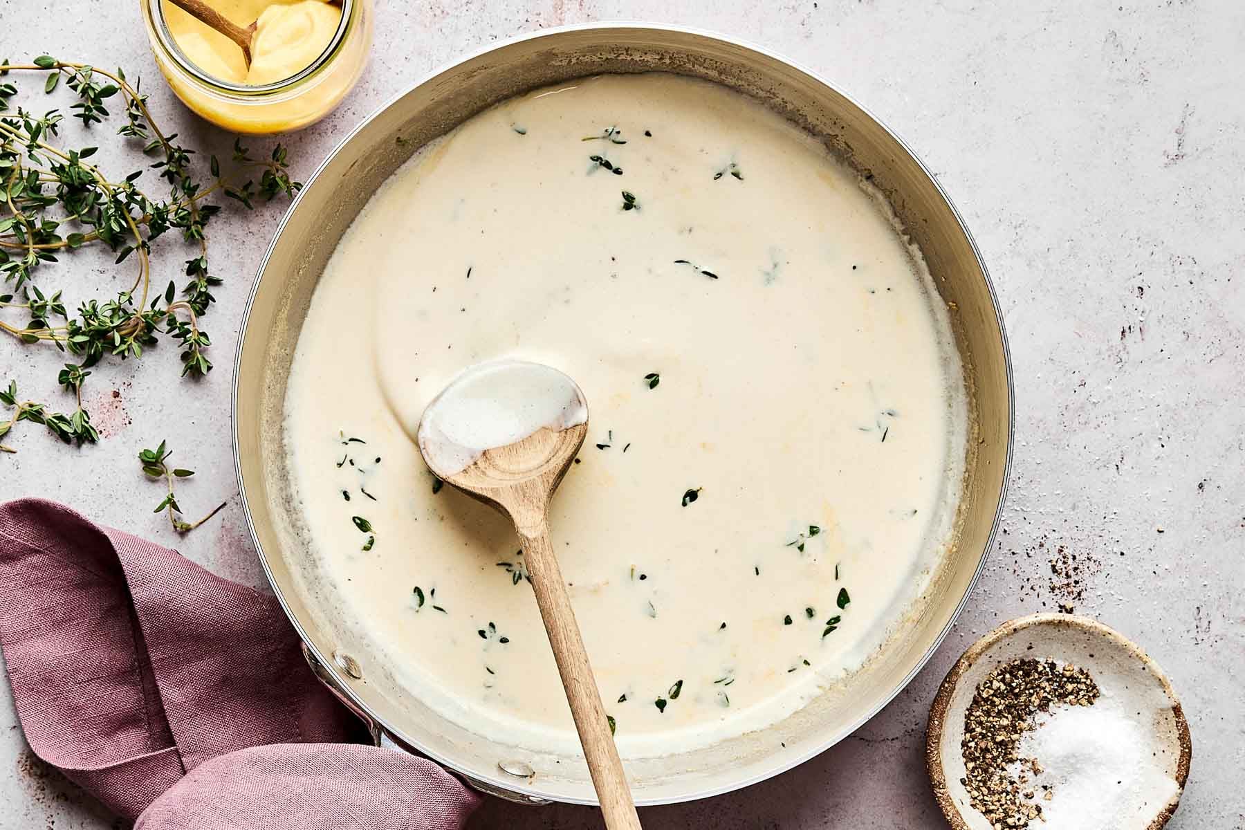 - Build the braising cream: Deglaze the skillet used to sear the leeks with white wine, scraping up any browned bits from the bottom of the pan. Simmer until reduced by about half. Reduce the heat to medium-low and stir in the cream, Dijon, and fresh thyme leaves. Season with a scant ½ teaspoon kosher salt, plus a few twists of black pepper. Gently simmer 2-3 minutes, until the sauce is slightly thickened and coats the back of a spoon. Avoid boiling, which can cause the cream to separate.