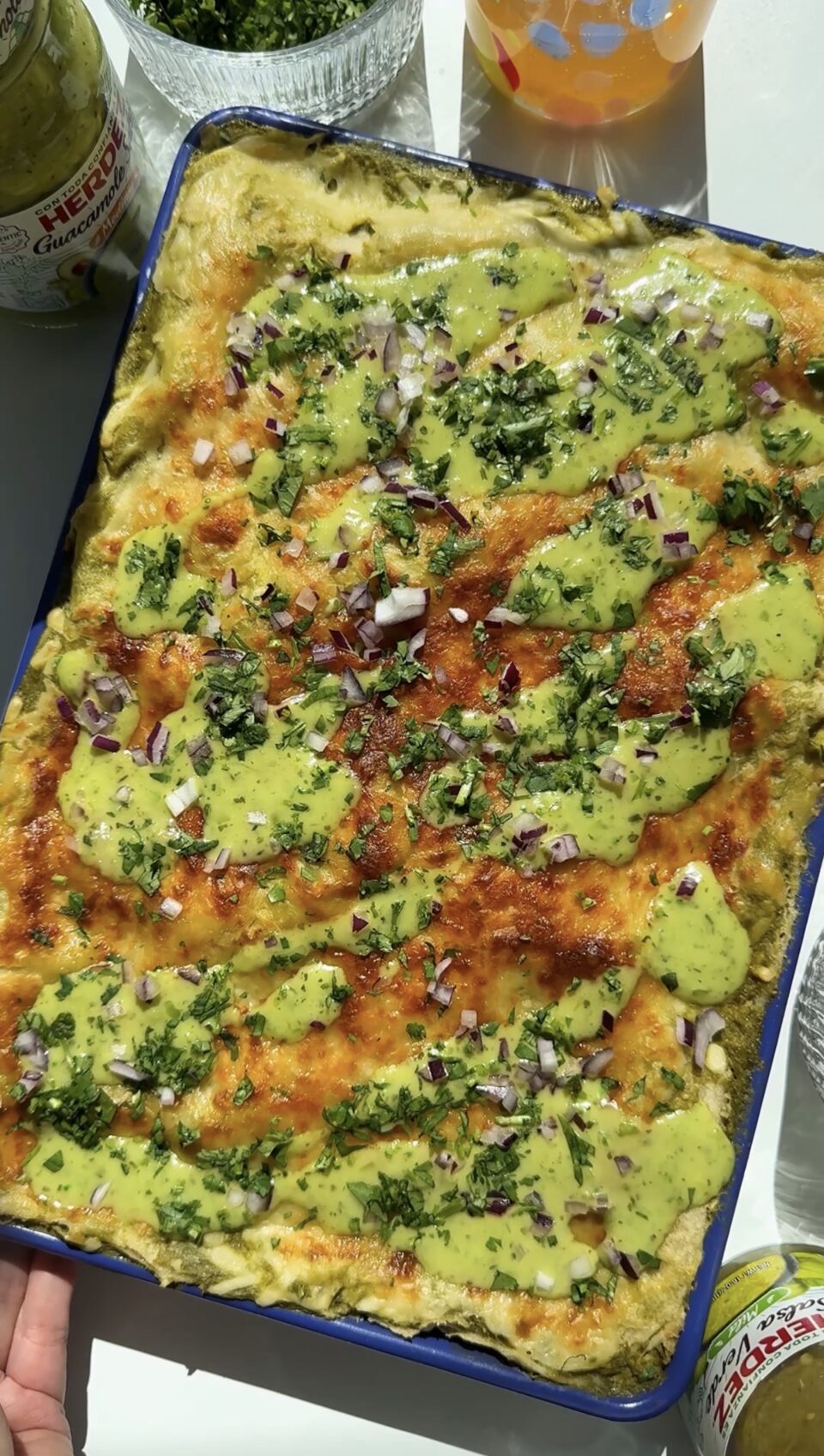 Instead of rolling individual tortillas, everything is layered into a sheet pan with a tangy, creamy salsa verde sauce, tender shredded chicken, and plenty of melty cheese. Baked until bubbly and golden, it’s a low-effort, high-reward dinner that comes together in about an hour.