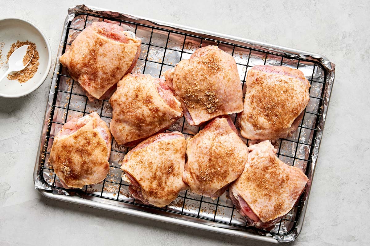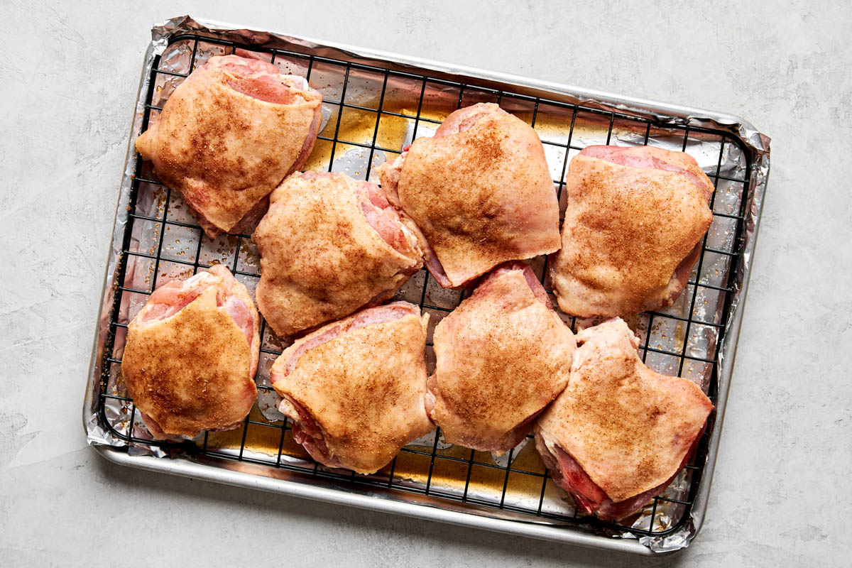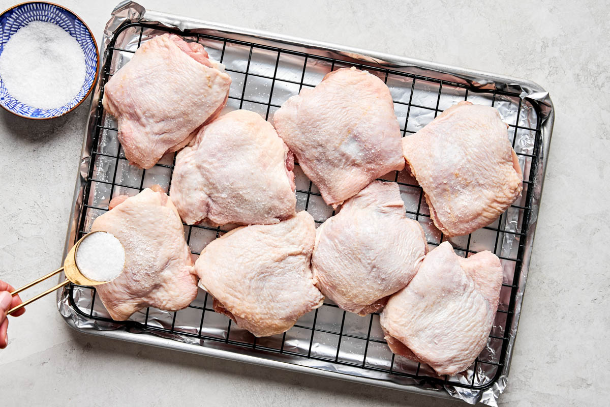 - Dry brine the chicken thighs and rest overnight: Carefully transfer the rack of chicken thighs back to the foil-lined baking sheet. Pat them as dry as possible, then season liberally with the dry brine, making sure to add some both under and over the skin. Transfer to the refrigerator and rest overnight, uncovered, to dry out the skin and season the meat throughout.
