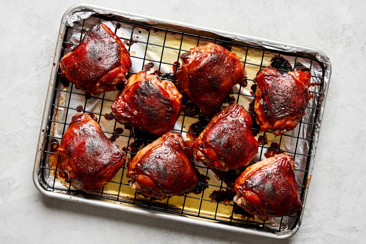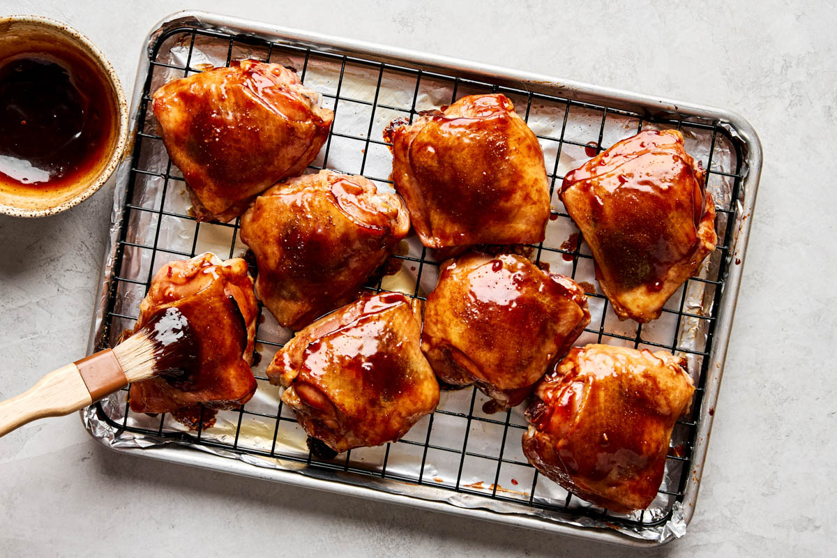 - Mix the Peking glaze and glaze the chicken: Add all listed ingredients to a medium bowl and whisk to combine well. Brush the glaze onto the underside and under the skin of each thigh, avoiding brushing directly over the skin. You will have some glaze leftover – reserve it for roasting. Return the chicken to the rack.
