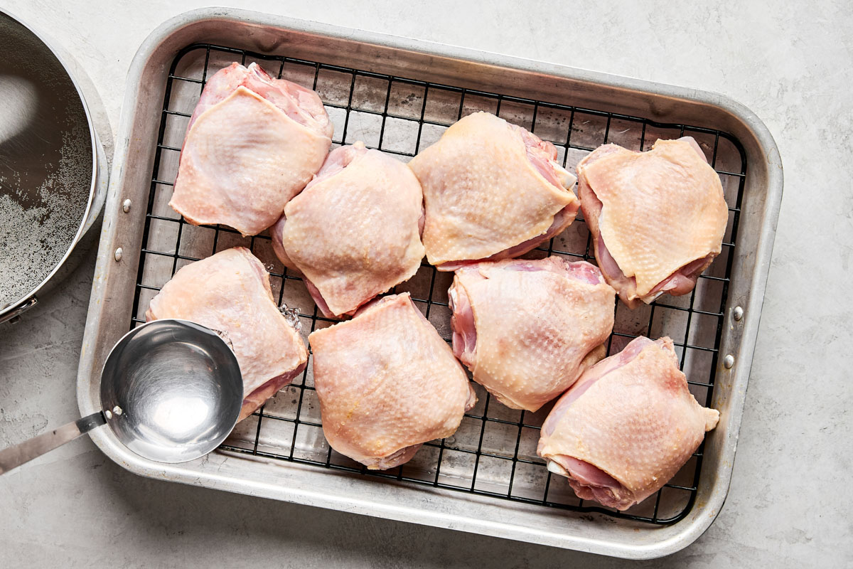 - Prepare the chicken thighs: Trim and discard any excess fat and skin from the back and sides of the chicken thighs. Work your fingers under the skin on the top of each chicken thigh, gently loosening it from the meat while keeping the edges intact. Pat the trimmed chicken thighs as dry as possible with paper towels, then place on a foil-lined rimmed baking sheet fitted with a rack. Sprinkle 1 tablespoon kosher salt over the skin, covering the surface as evenly and completely as possible. Set aside for 1 hour.