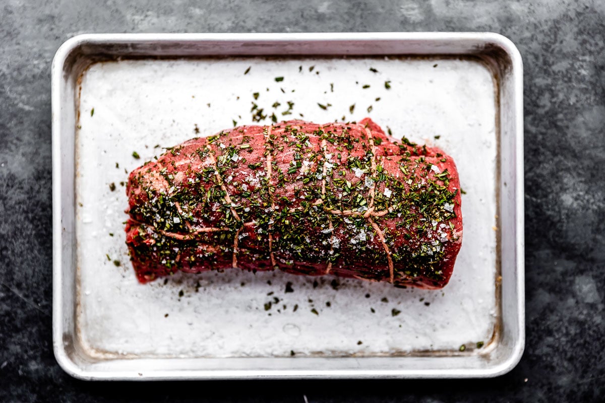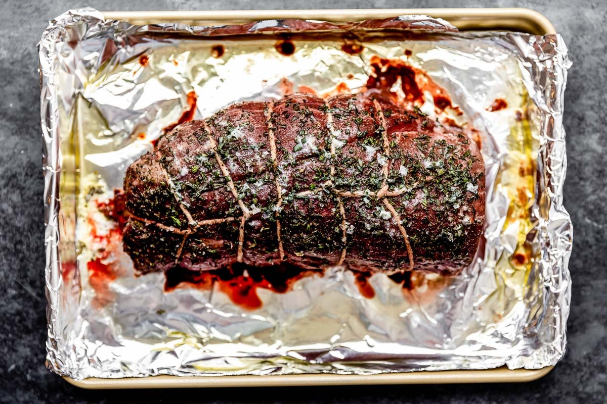 - Beef tenderloin prep (1 day before roasting): The day before roasting, prepare the beef tenderloin. Use paper towels to pat the entire surface of the beef tenderloin as dry as possible. Secure with butchers twine every 2-3 inches along the length of the beef tenderloin for even roasting. Drizzle olive oil over top, then rub to coat the entire surface of the roast. Generously season with kosher salt and ground black pepper; a good rule of thumb is 1 teaspoon kosher salt per pound of beef. Sprinkle the finely chopped rosemary and thyme over top. Place the prepared roast on a foil-lined rimmed baking sheet, then transfer to the refrigerator. Refrigerate overnight, uncovered.