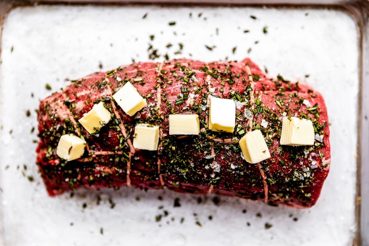 - Roasted beef tenderloin prep (day of roasting): 2 hours before you’d like to begin roasting your beef tenderloin, transfer it from the refrigerator to the kitchen counter, allowing it to come to room temperature for even cooking. When you’re ready to begin roasting your beef tenderloin, preheat the oven to 225 degrees F, ensuring a rack is situated in the center position of your oven. Dot butter over the top of the beef tenderloin.