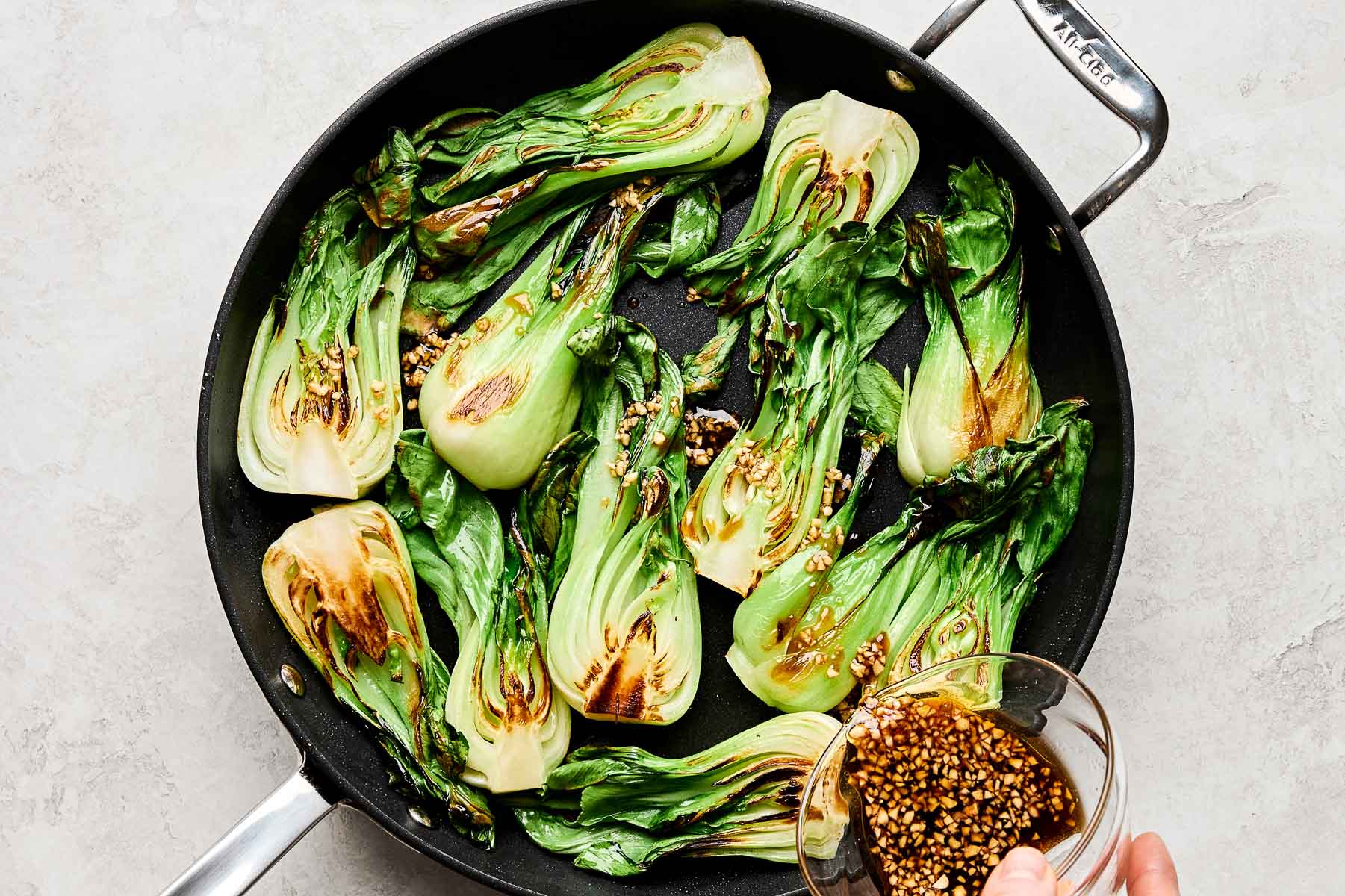 - Sear: Heat the oil in a medium nonstick skillet over medium-high heat. Add the bok choy, season with salt and MSG (if using), and sear 2-3 minutes per side until golden brown. Meanwhile, whisk together the shoyu, water, sesame oil, sugar, and garlic in a small bowl.